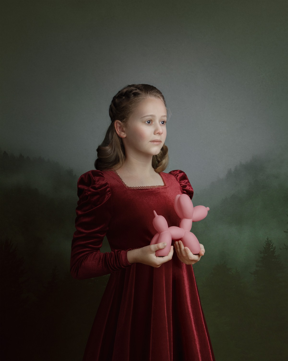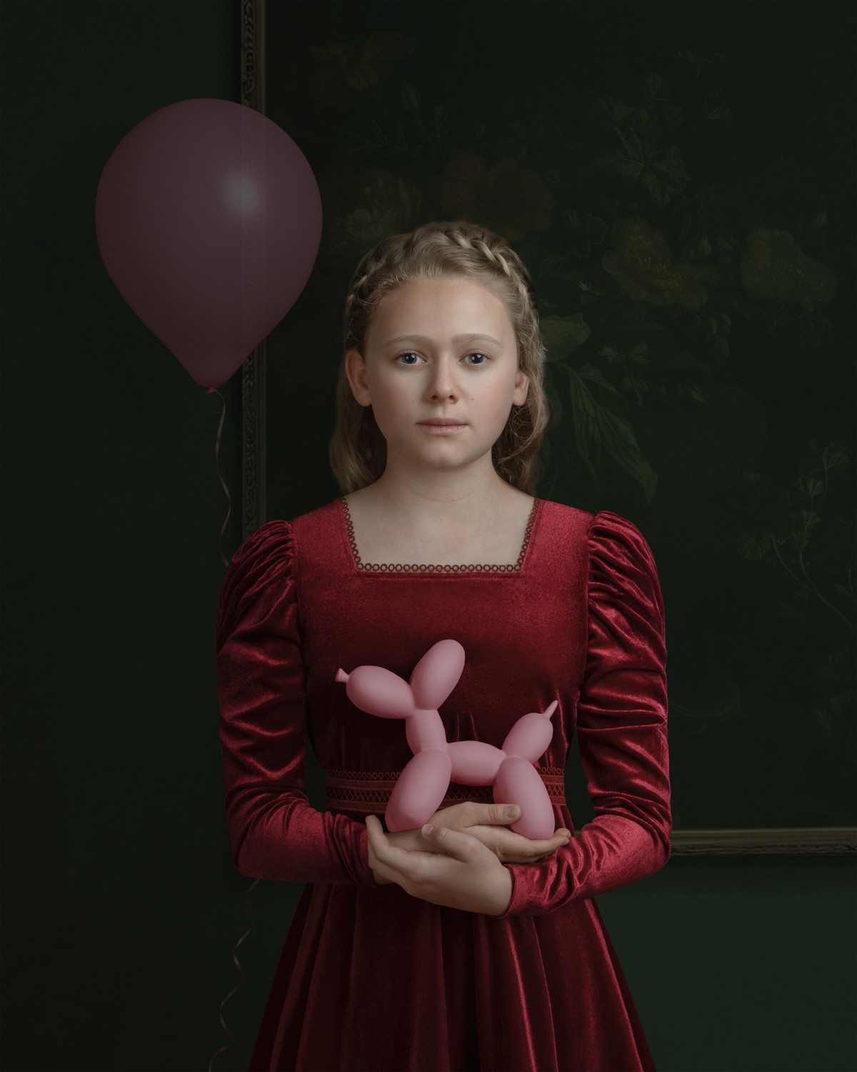 This portrait reimagines the Renaissance muse through a contemporary lens. A young woman in burgundy velvet holds a pink balloon dog — an icon of modern art — with quiet reverence. The work reflects on the dialogue between high art and pop culture, beauty and artifice, past and now.