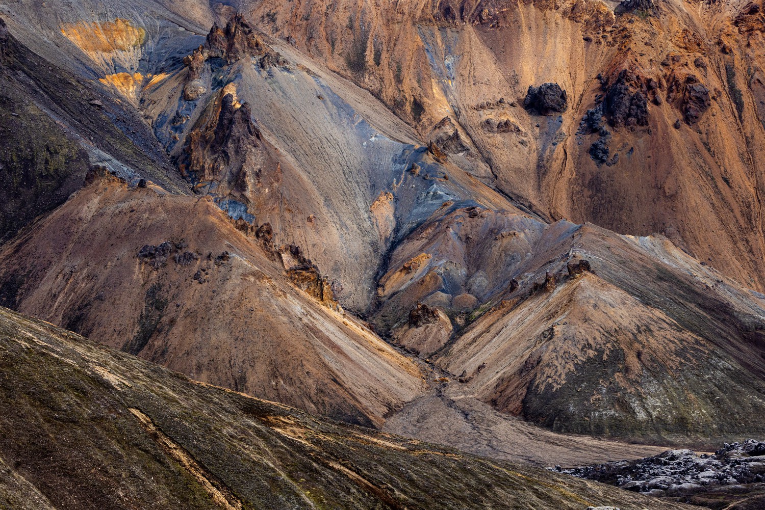 A close-up of the mountains in Landmannalaugar showcases a stunning array of colors and textures, resembling brushstrokes on a canvas, truly earning its title: a painter’s palette in the wild.