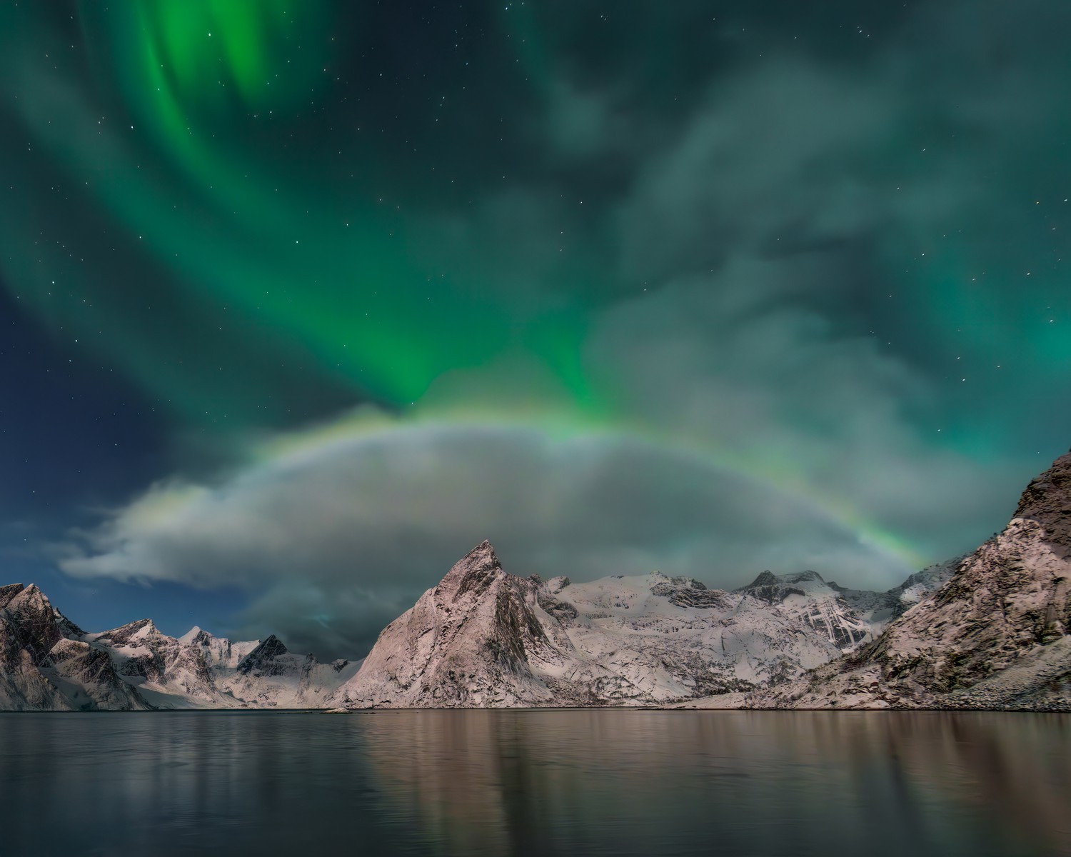 I captured this image off the deck of a fishing hut where I was staying in Lofoten, Norway. The aurora was just getting underway, yet competing with a full moon positioned behind me that lit up both the mountains in the foreground and the rainbow that had formed just below the aurora.