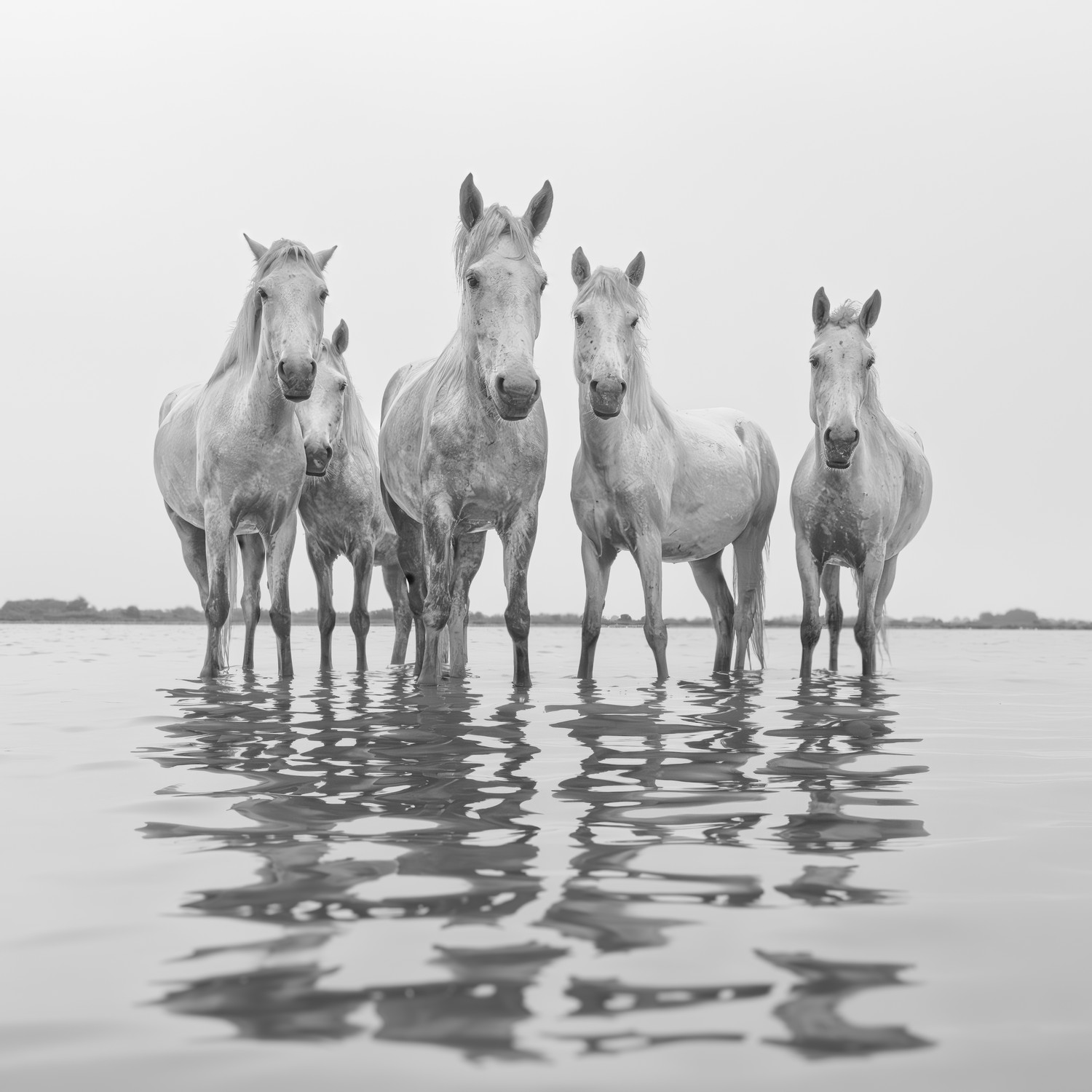 A group of white horses pause to study me in the tidal pools of Camargue.
