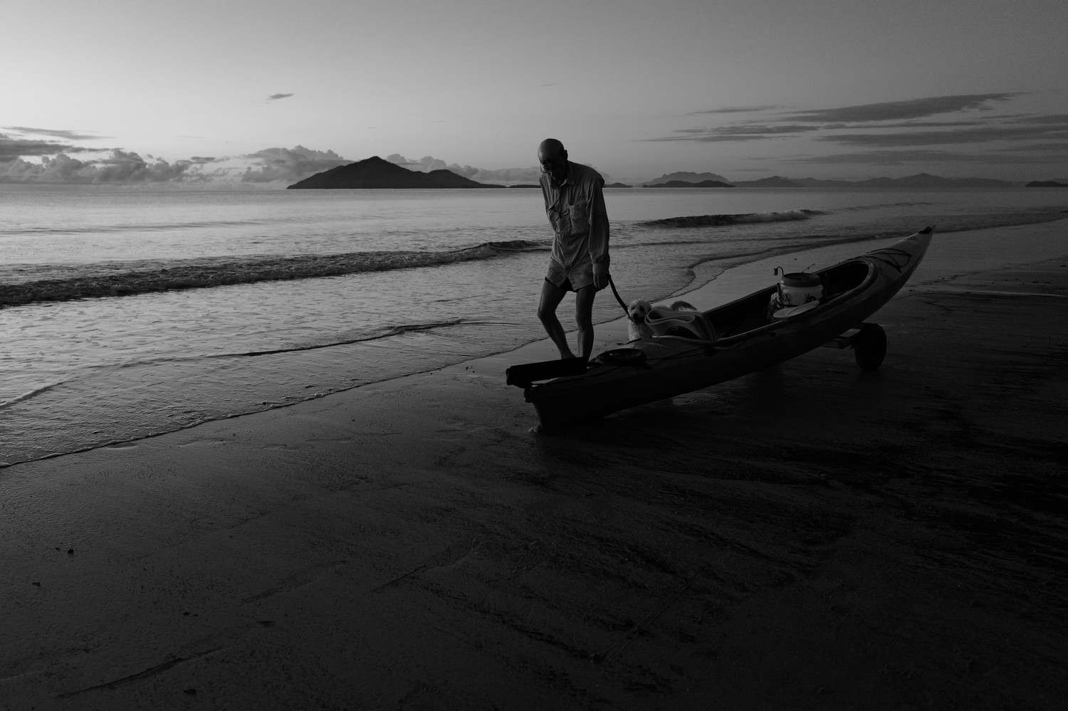 Man returns with his loyal companion after an early morning kayak to Dunk Island.