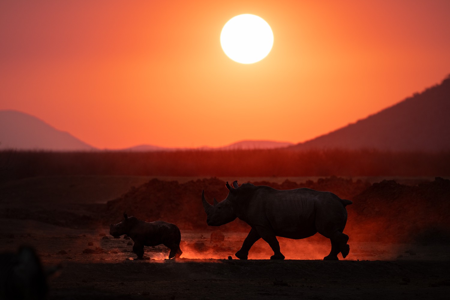 A rhino cow and her calf had just finished drinking when a large bull rhino disturbed them. As they ran away from him they kicked up the dust which made the ground look as though it was on fire.
