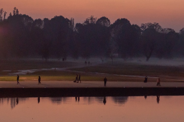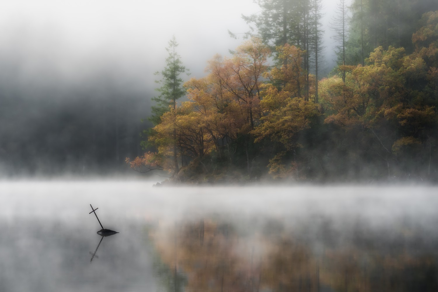 A thick morning fog begins to burn off a loch in the Scottish Highlands and reveal the fall colors on the far shore. The iron cross in the foreground has many local stories about how it came to be and its meaning that range from a simple warning for boats of shallow water to classic urban legend.