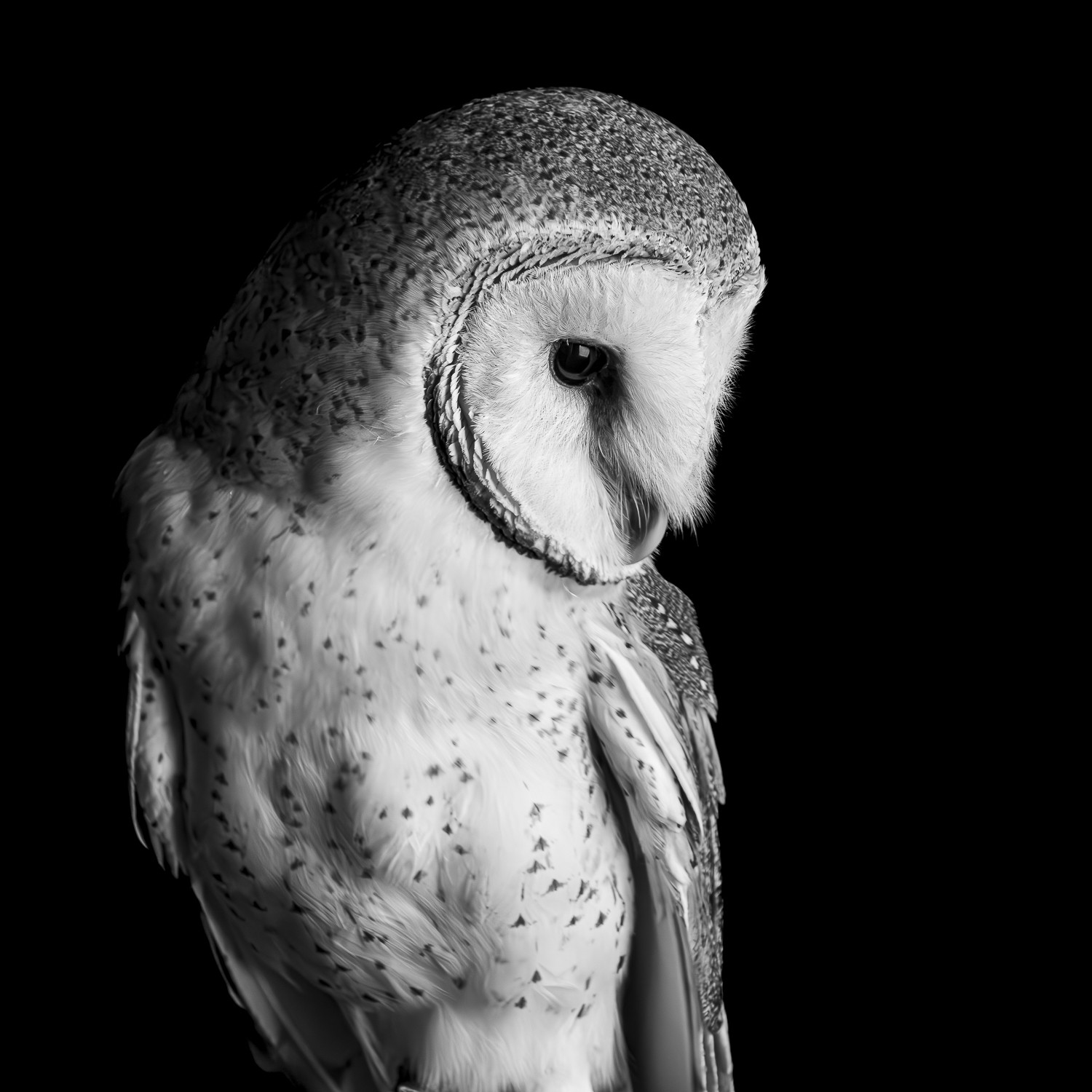 Bathed in natural light, the barn owl gazes downward, its pale feathers glowing against the dark barn interior. The contrast reveals its quiet elegance—an emblem of silent grace framed by shadow and stillness.