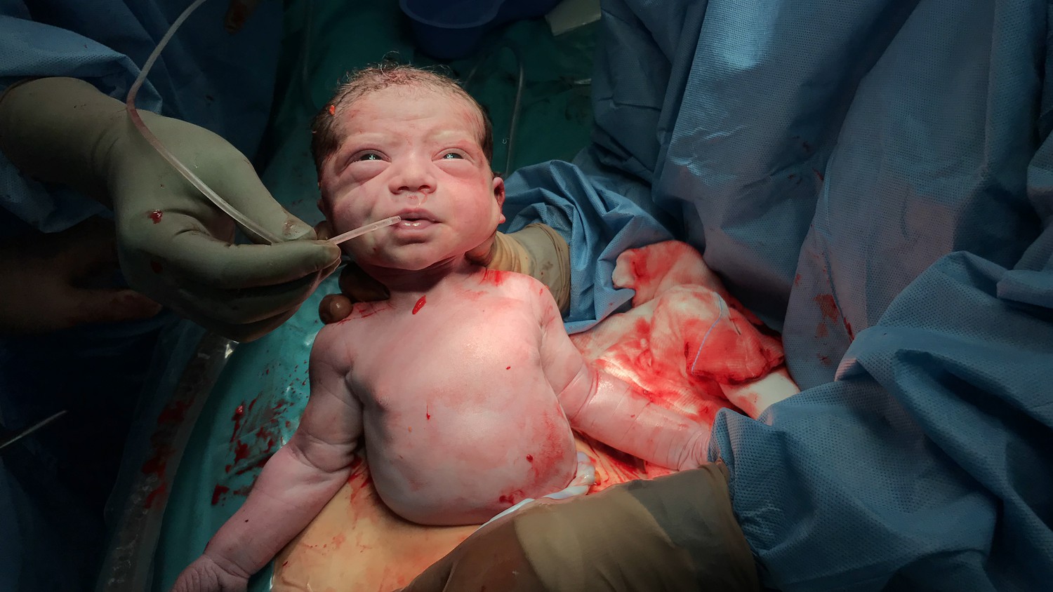 This photo captures the exact moment in which my son was born, still half inside his mother. It was the exact second his eyes open for the first time. The light coming from the top seems to coming from the sky. His swollen eyes and tired arms are a testament to the hardship of 45 hours of labour