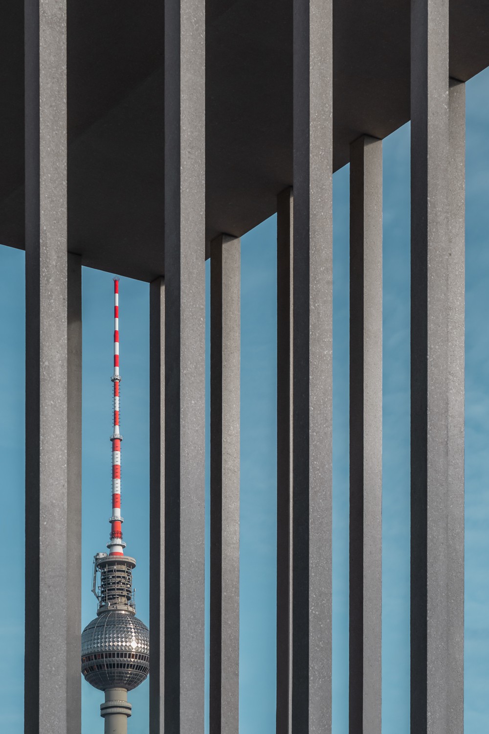A tall, slender tower, the Berlin TV Tower, is seen framed by numerous vertical gray concrete pillars. The pillars are in a grid pattern, creating a geometric frame around the tower.