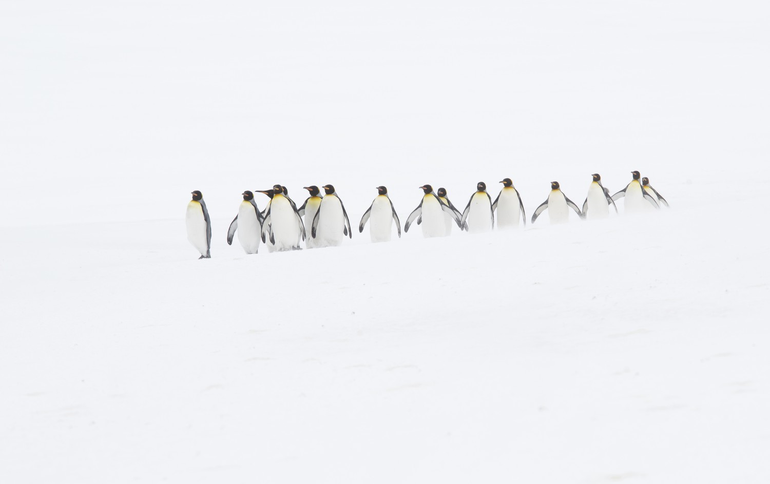 A group of King Penguins braves the storm as hey return from the sea, their bellies full, to provide for their offspring