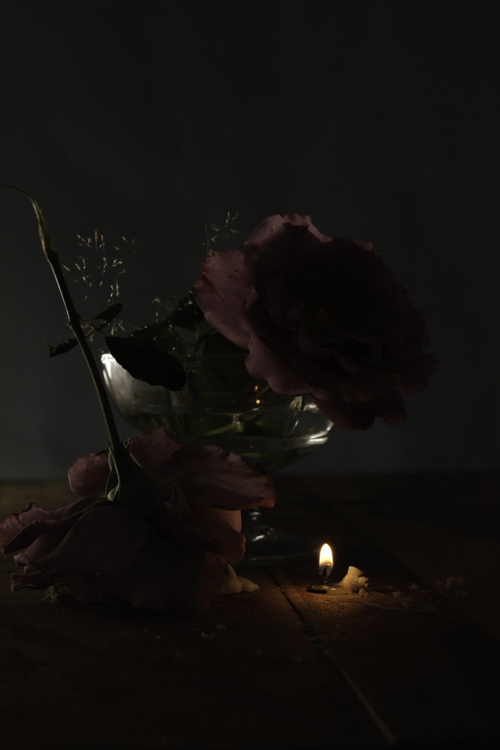 two roses placed with burning out candle