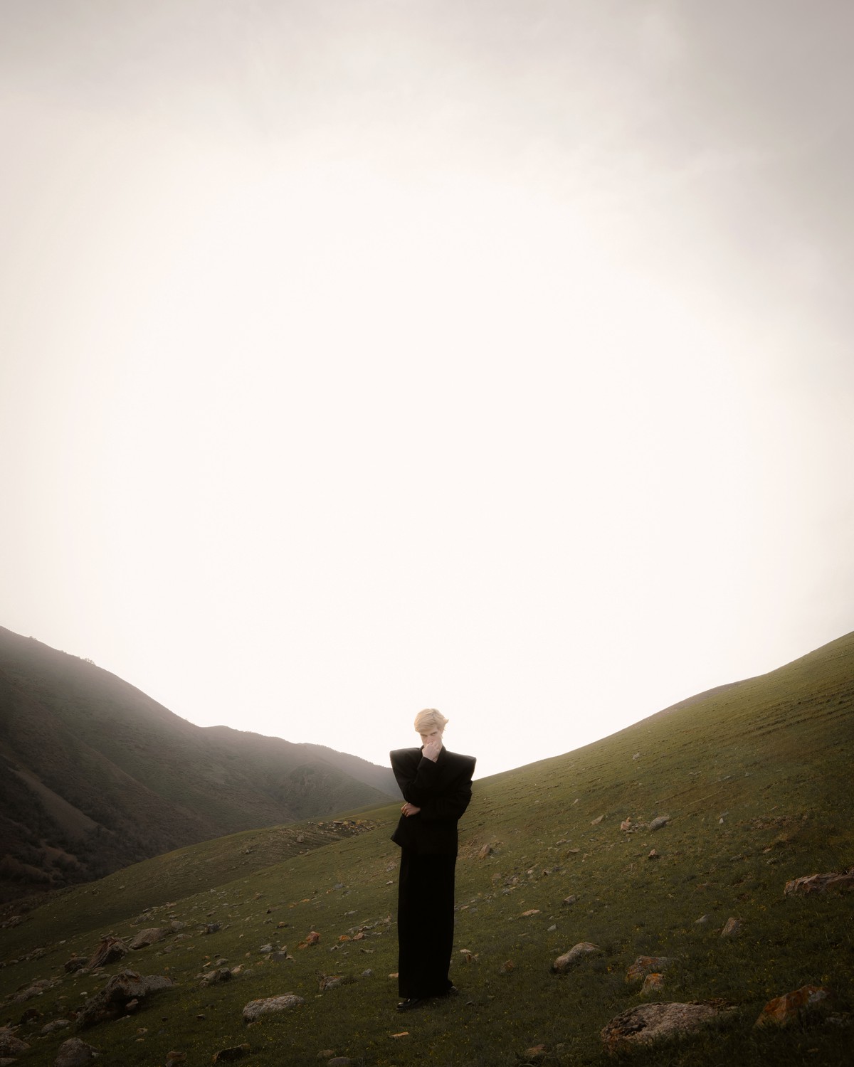 The suit is tailored to give the figure a sculptural sharpness and add an air of mystery to the image. The background is flooded with a vast, almost bleached sun or diffuse light, making the model’s silhouette appear strikingly graphic and high-contrast against the gentle outlines of the mountains.
