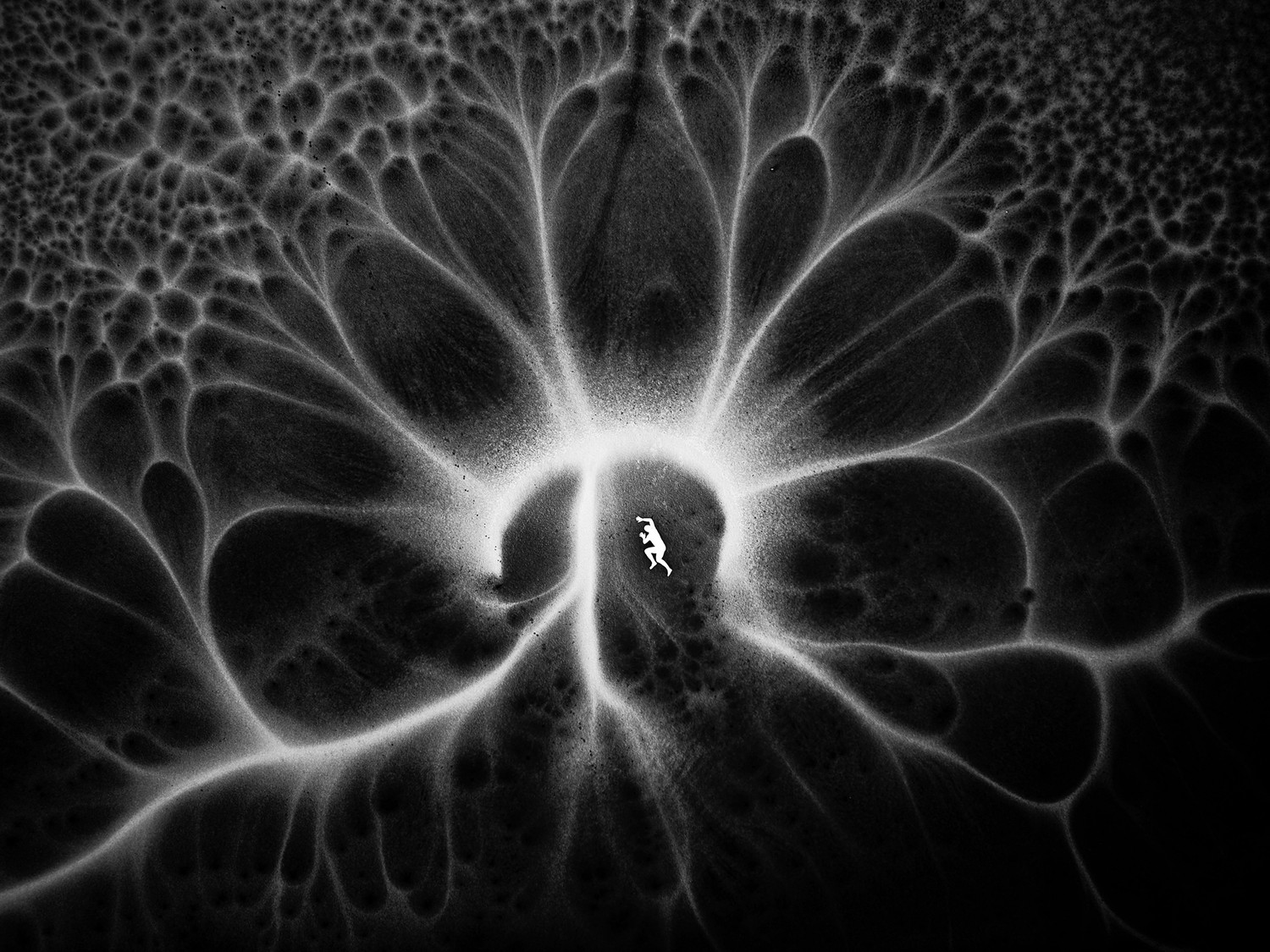 The photo is a record of natural structures – the patterns that had formed on the frozen lake under the influence of various weather conditions. When I noticed this amazing pattern, I decided to become a part of this image, at least for a moment.