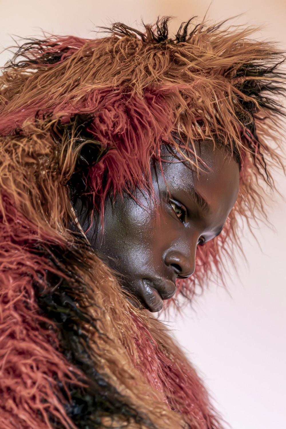 A portrait of an young and intense African male, showcasing his striking, sculpted features. His strong, angular jawline and high cheekbones create a refined, masculine structure. Full lips and a defined nose bring balance and harmony. His intense eyes add depth and emotion to this image.