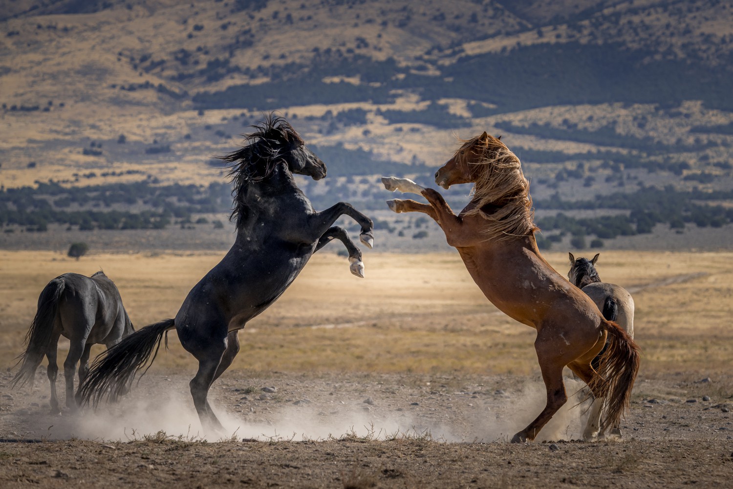Two mature wild stallions from the Onaqui herd settling a disagreement over a couple of mares.