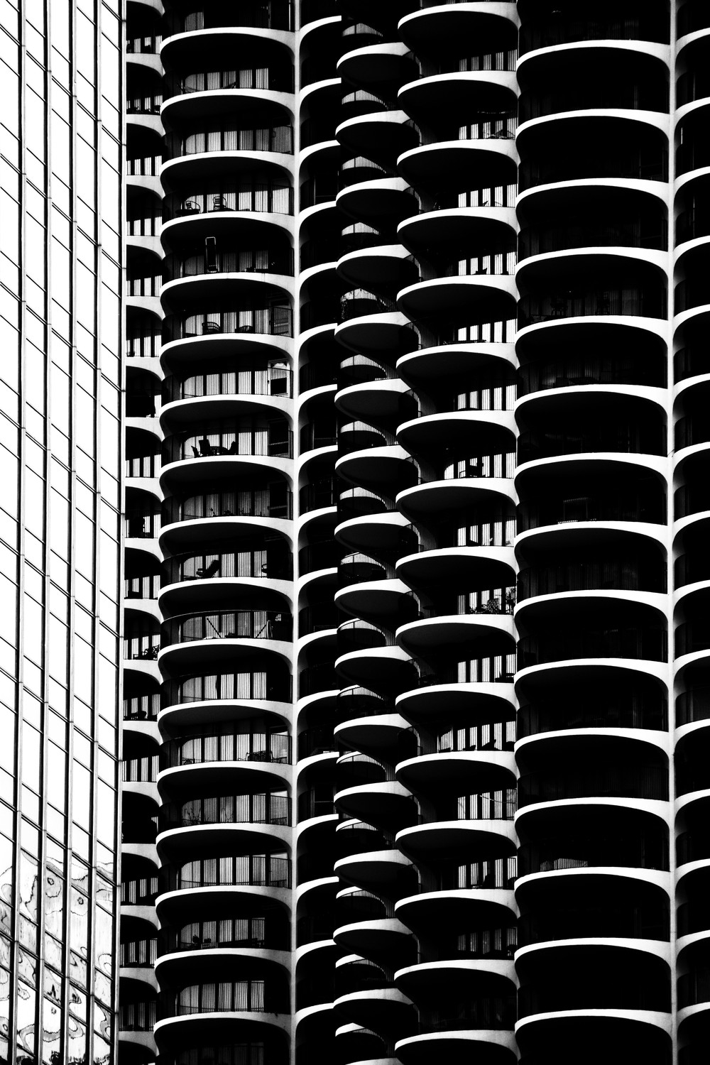 The gradational interplay between the lines of 321 North Clark and the curves of Marina City is almost like something straight out of a computer game. 8/9/24, Chicago, IL