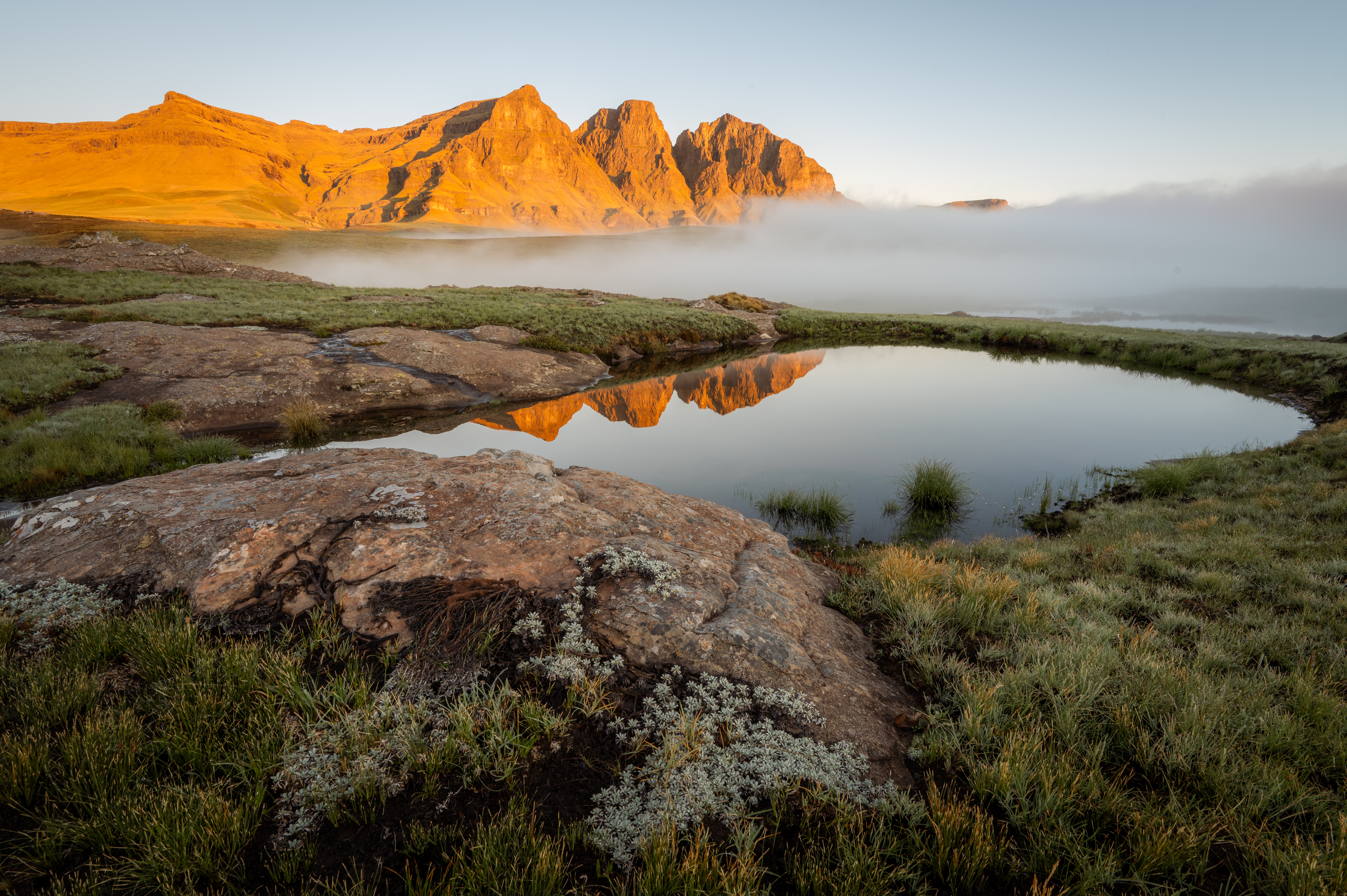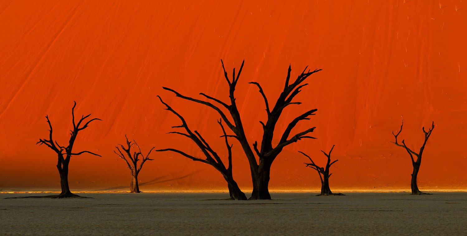 This photograph was taken in Namibia as the sun was setting behind one of the highest sand dunes in the world. There are only seconds to capture the moment the trees appear black from shadow of the dunes behind my camera, while the sand dunes in front of the camera are lit up by the setting sun.
