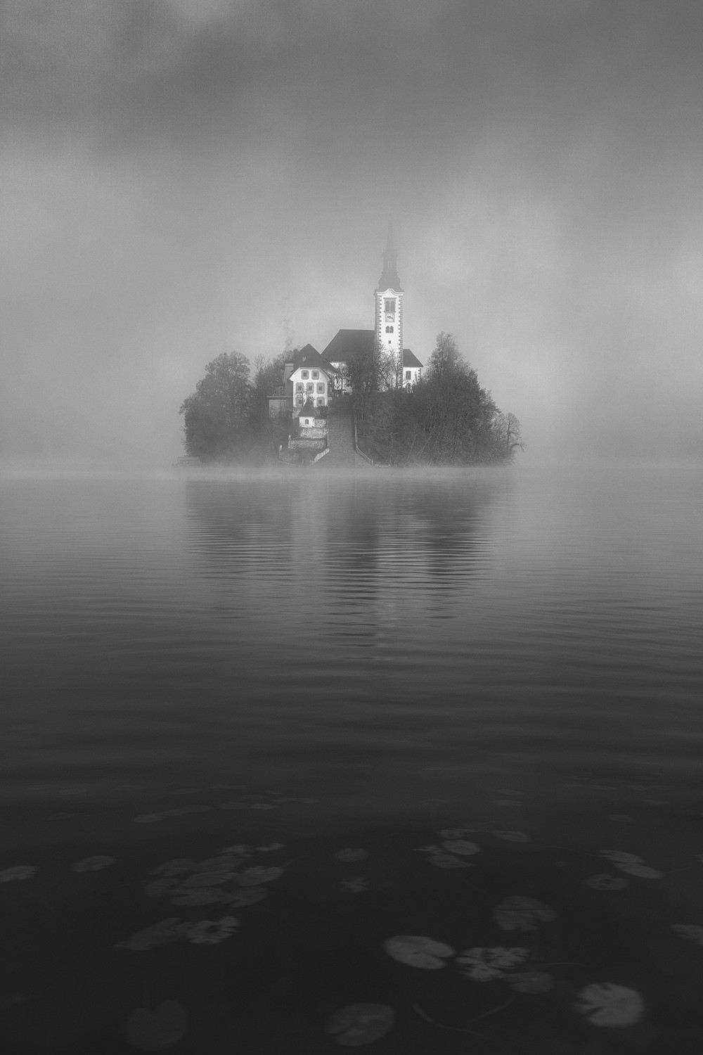 A serene black-and-white photograph of Lake Bled, capturing its iconic island shrouded in morning fog and mist.