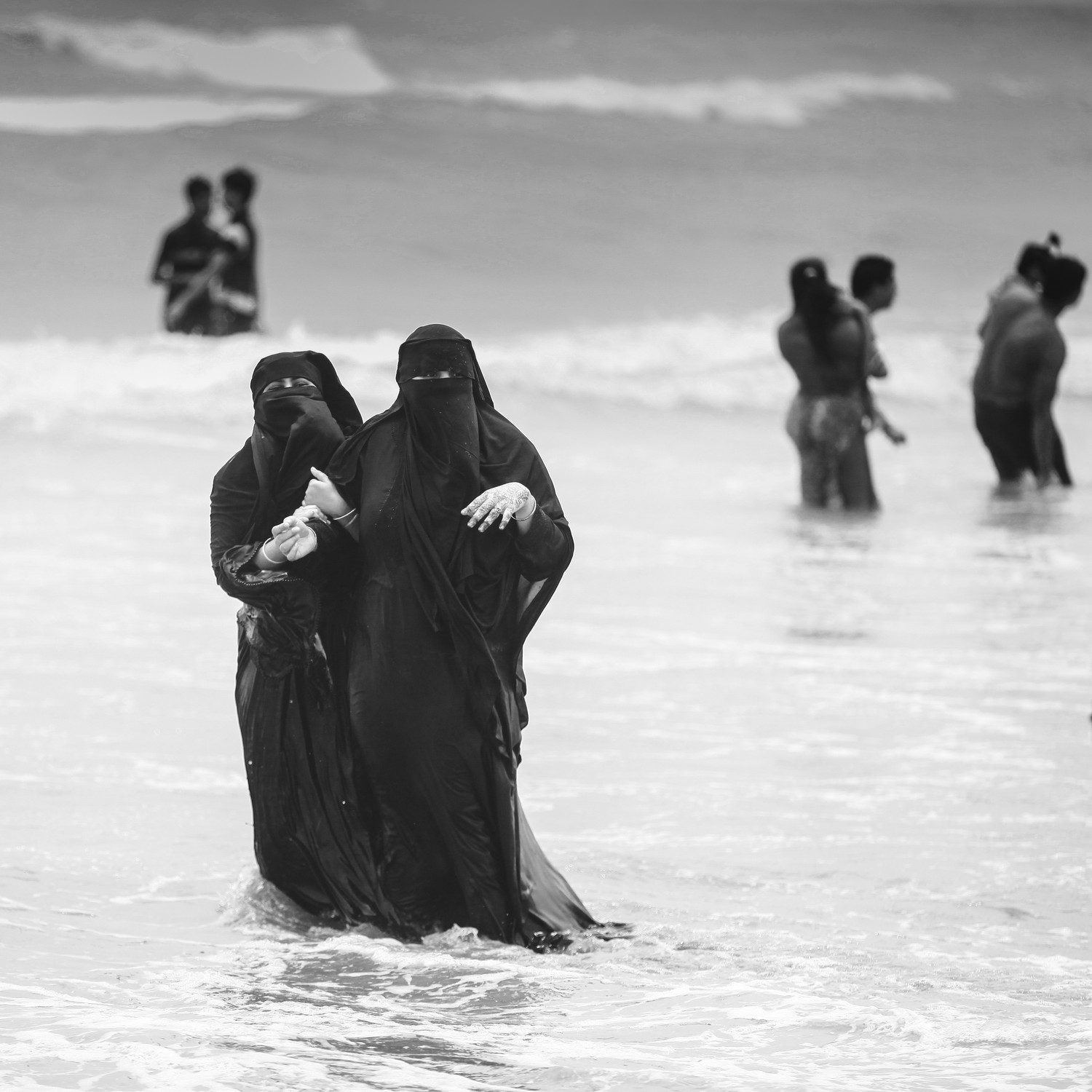 Two women in black niqabs wade through the waves at Cox’s Bazar Beach, Bangladesh, finding joy and connection in the embrace of the sea.