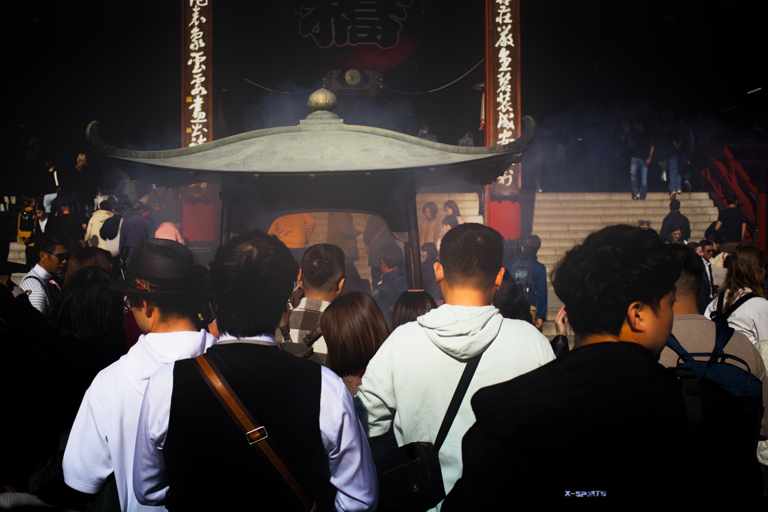 Senso-ji Temple was very busy, as always. With no option to capture a picture without the crowds, I decided to include them in my shot. I noticed the smoke from the incense burner, where people gathered for a religious ritual.