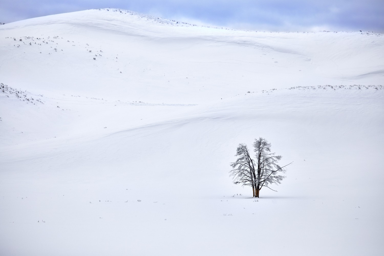 A winter scene in Yellowstone National Park: snow had blanketed the ground, with only a solitary tree standing out against the stark white landscape. The bark on the tree had been peeled off by animals who used it as a scratching post.
