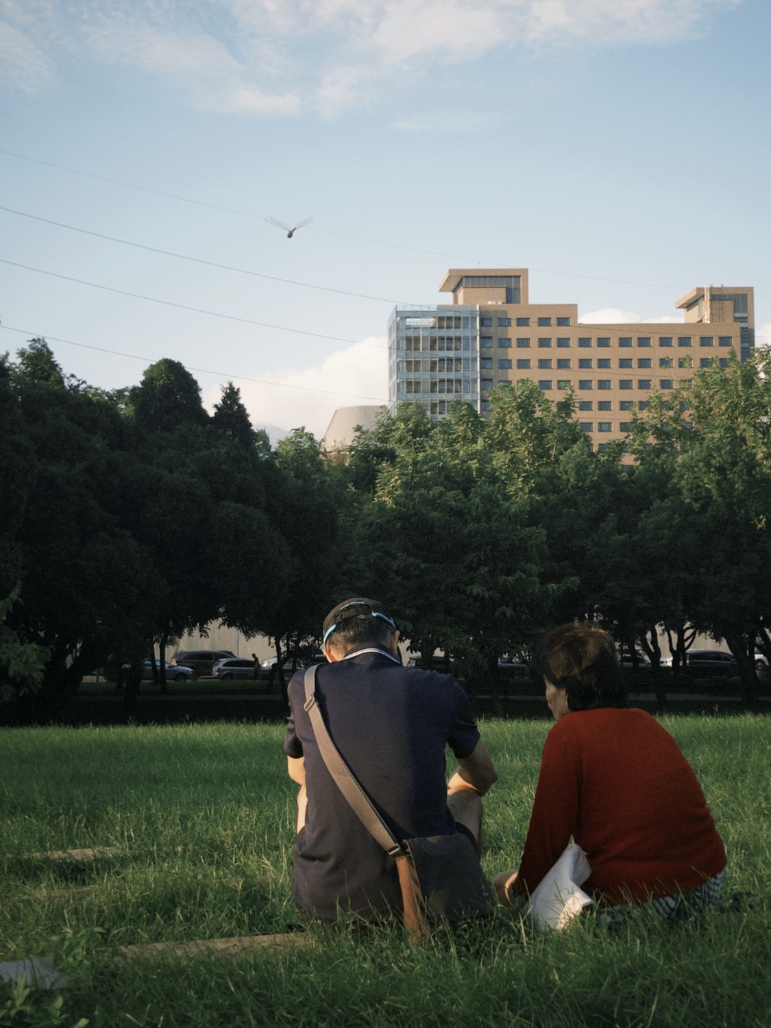 A couple sits on the grass, with the soft sunlight gently falling on them. Without the need for words, they simply sit together, enjoying this moment of tranquility—simple yet sweet.