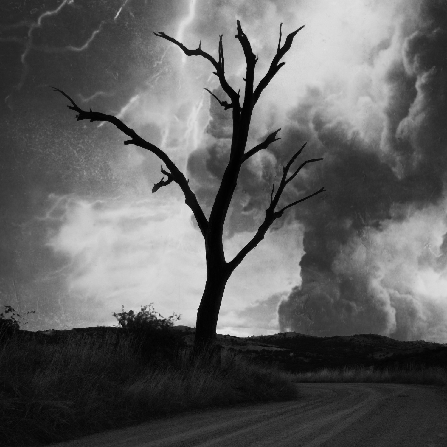A old dead tree silhouetted against a stormy sky.