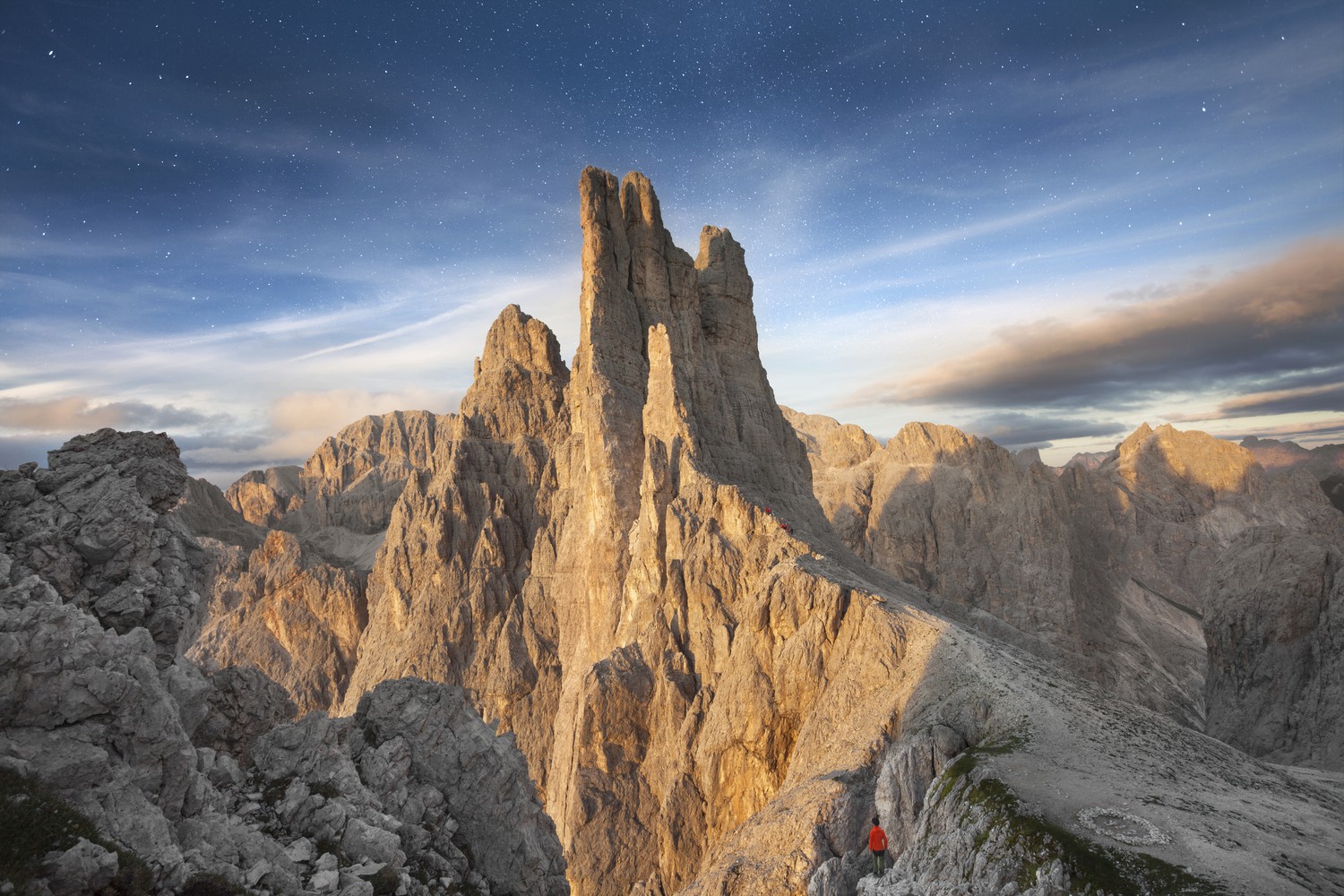 A majestic view of the Vajolet Towers in the western Dolomites during a summer sunset.