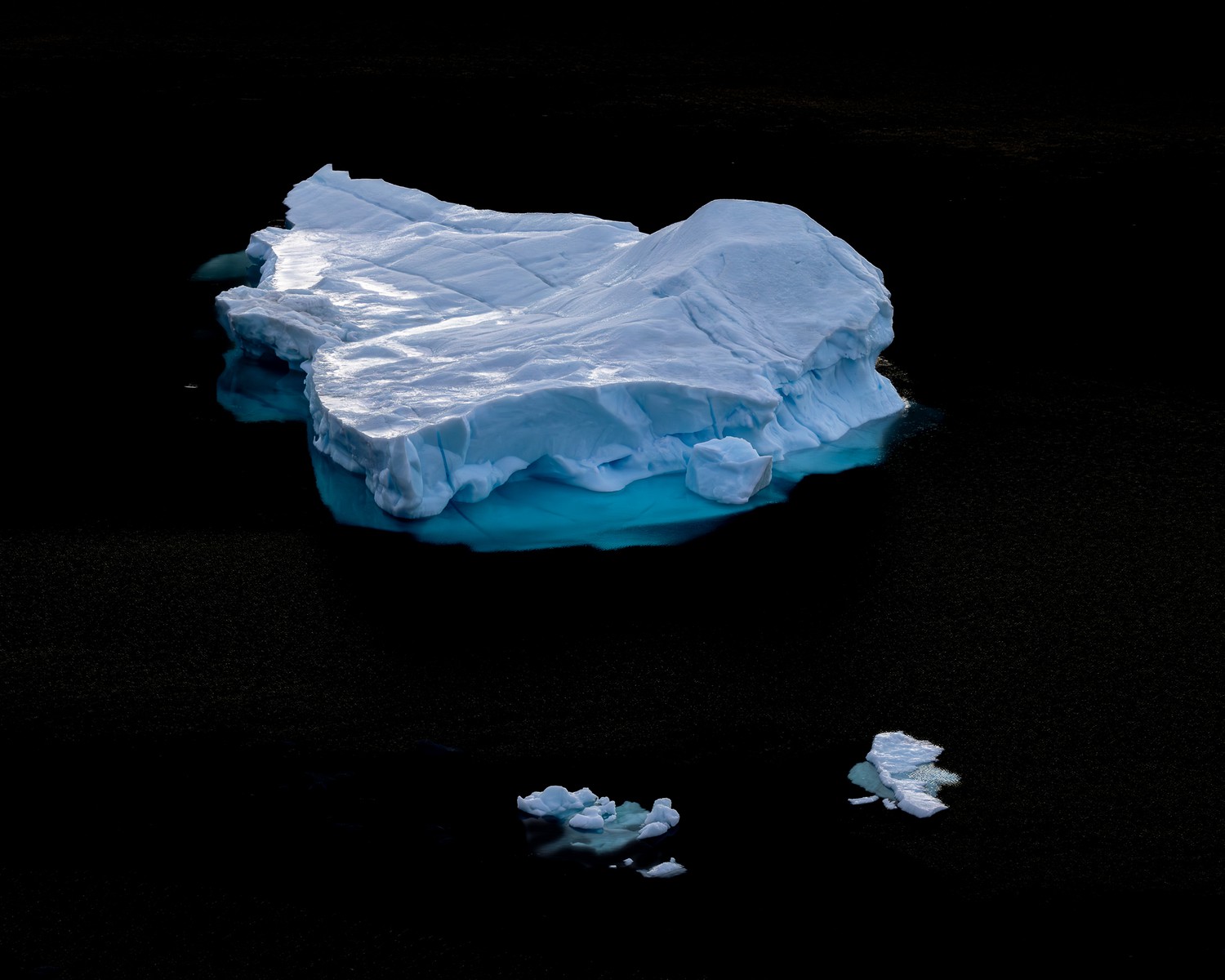 From my vantage point on a ridge I spotted a large chunk of ice floating in dark water. The two smaller pieces that flanked it gave the scene a sense of scale.