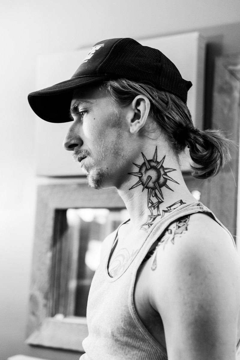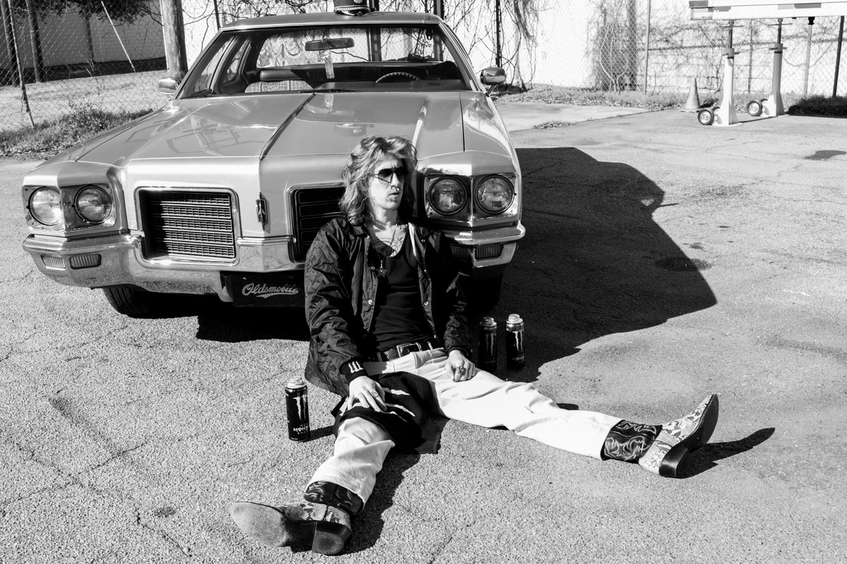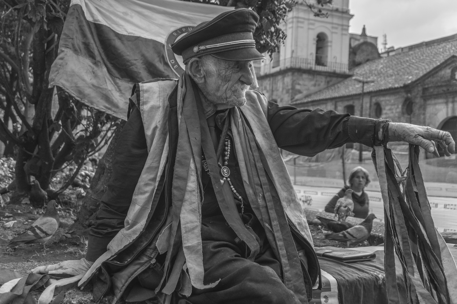 A homeless person wearing ribbons and soldier attire