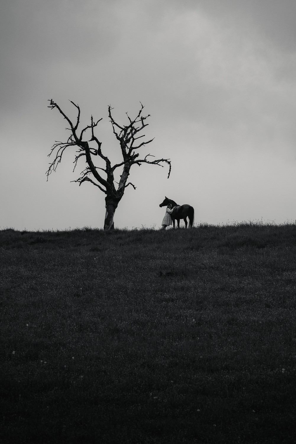 This emotional photo was taken on a rainy morning. From the very first moment, the ghostly tree caught my attention. She leans on her horse — her rock — who shields her from the grasping branches, as if protecting her from the tree’s eerie pull.