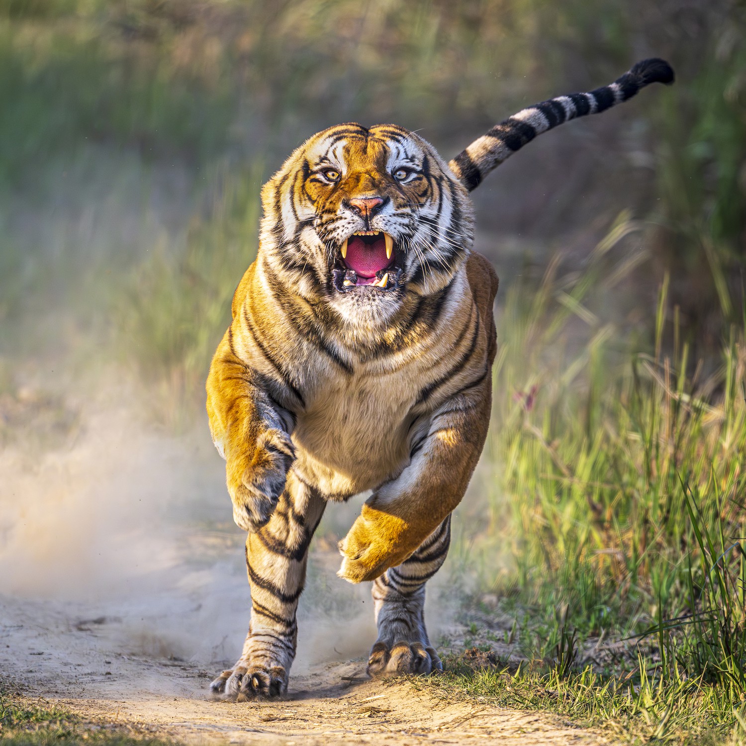 A portrait of a charging Tiger from the Pilibhit Tiger Reserve in India.
