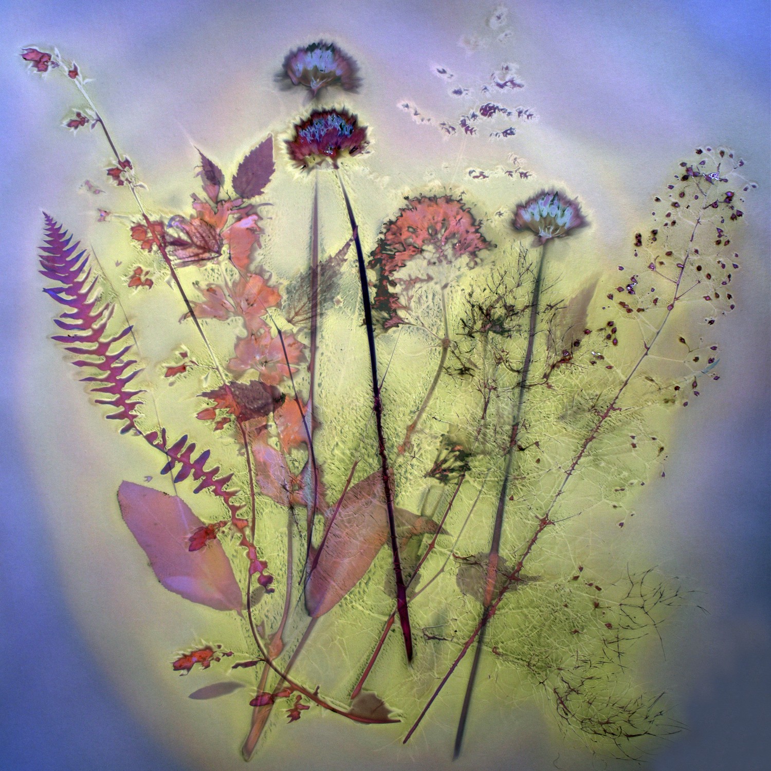 Garden plants were used to make photograms, exposing them in sunlight on to Ilford Ilfobrom Galerie FB black and white photographic paper. The resulting images were then combined digitally, in order to produce this ethereal floral image that gives the effect of a wild garden.