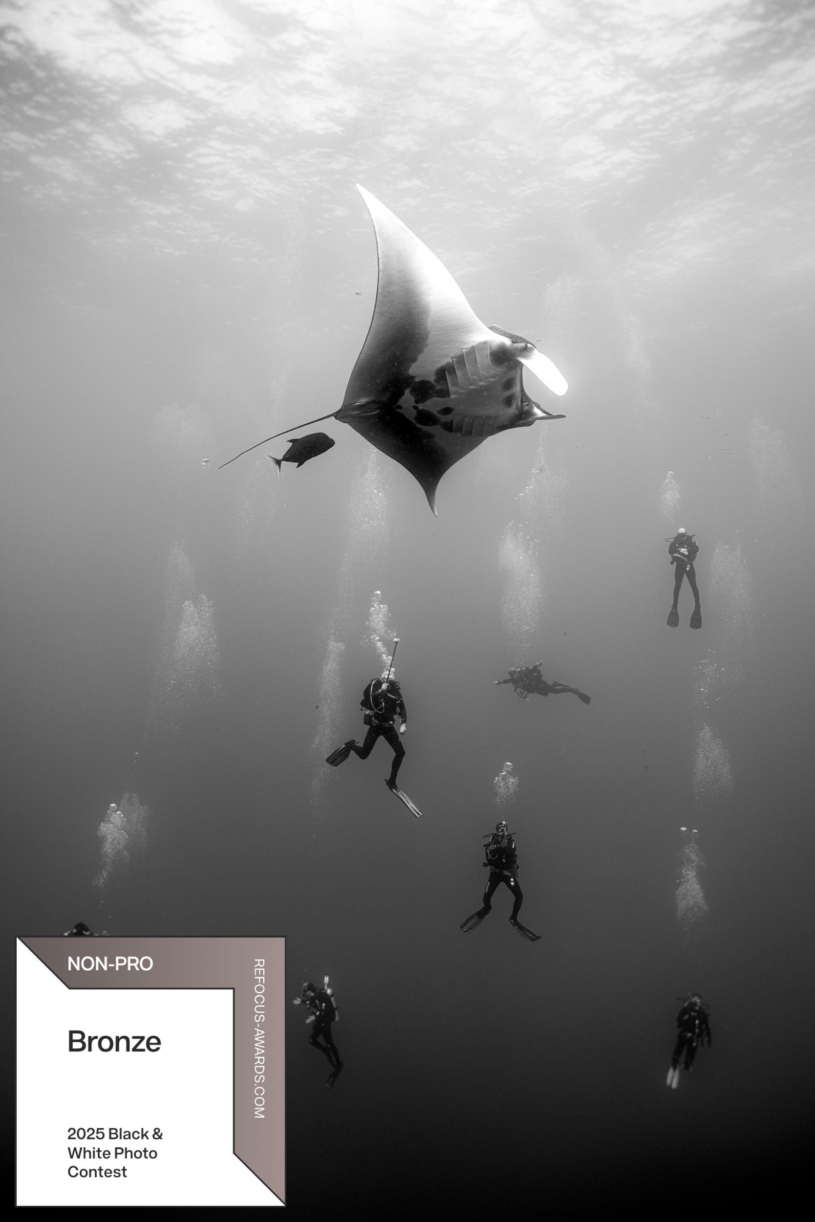 With Hanging Divers, I think that’s what makes the image so striking: the smooth greyscale from the light at the surface to the deep blacks below, with the divers just suspended there. And then, of course, the oceanic manta ray appears in the background, perfectly mid-turn — it was a lucky, funny, and surreal moment.